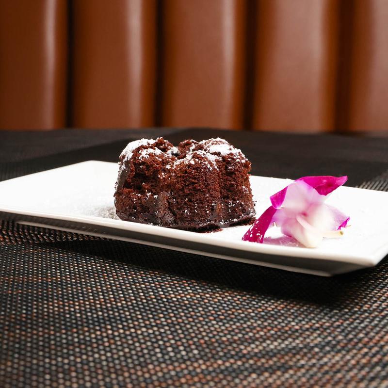 Molten chocolate ganache center surrounded by decadently rich chocolate cake dusted powdered sugar.